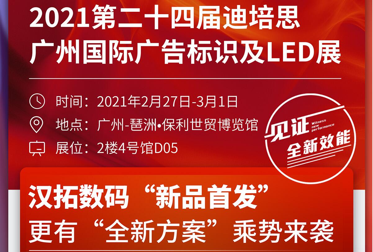 另外,漢拓新春首場-2021廣州迪培思國際廣告標(biāo)識(shí)及LED展將于明日(2月27日)在廣州琶洲保利世貿(mào)博覽館隆重舉行,漢拓展位在2樓4號(hào)館D05,此次漢拓?cái)?shù)碼將攜最新UV打印機(jī)產(chǎn)品參展,讓您見證全新工業(yè)化效能,期待各位新老朋友蒞臨參觀指導(dǎo)。