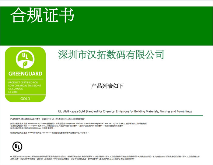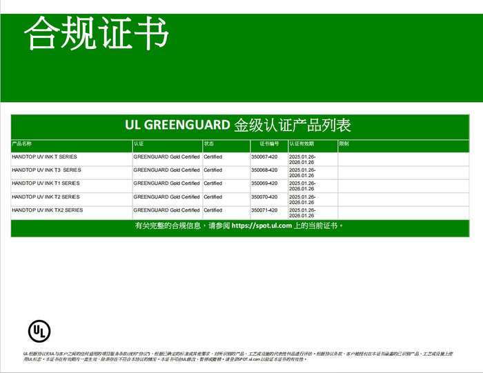 在全球可持續(xù)發(fā)展浪潮與制造業(yè)綠色轉型需求的同頻共振下,UV打印機國內高端品牌漢拓數(shù)碼再次以核心實力贏得國際認可。公司旗下多款UV墨水成功通過全球嚴苛的環(huán)保認證之一:UL 綠色衛(wèi)士金級認證(UL GreenGuard GLOD )。