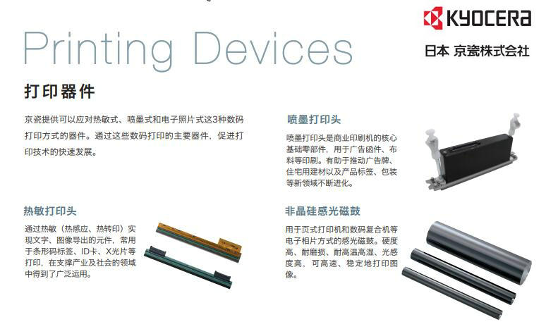 1959年創(chuàng)立的日本京都陶瓷(后簡稱“京瓷”),主打產(chǎn)品是燒制品中的IC用陶瓷封裝。發(fā)展到現(xiàn)在,京瓷集團(tuán)已深入到信息通信、汽車、節(jié)能環(huán)保、醫(yī)療保健等市場,完善了原料、零部件、元件、機(jī)器、系統(tǒng)和服務(wù)整個(gè)供應(yīng)鏈。京瓷生產(chǎn)的噴墨打印噴頭也是uv打印機(jī)行業(yè)的知名品牌。