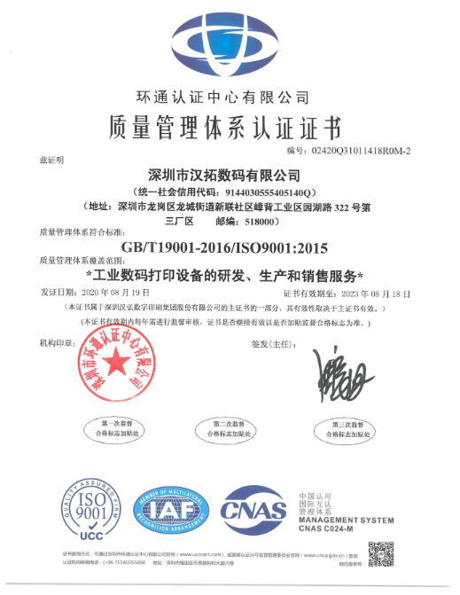 作為uv打印機(jī)行業(yè)的知名研發(fā)生產(chǎn)廠家,漢拓?cái)?shù)碼一直堅(jiān)持以歐美質(zhì)量為標(biāo)準(zhǔn),嚴(yán)格遵循質(zhì)量管理體系,力求為客戶生產(chǎn)出質(zhì)量硬、效率高、精度好的uv打印機(jī)。漢拓?cái)?shù)碼的產(chǎn)品質(zhì)量在市場上的口碑是相當(dāng)不錯(cuò)的,質(zhì)量的穩(wěn)定性也獲得了業(yè)內(nèi)的普遍認(rèn)可,也是行業(yè)內(nèi)為數(shù)不多的堅(jiān)持走自主創(chuàng)新的高新技術(shù)企業(yè)。2020年4月底公司啟動IS09001: 2015質(zhì)量管理體系認(rèn)證,質(zhì)量中心嚴(yán)格按照IS09001: 2015質(zhì)量管理體系標(biāo)準(zhǔn)( GB/T1901-2016),對各公司的認(rèn)證范圍、體系策劃、文件的編寫與發(fā)布、試運(yùn)行、內(nèi)審、管理評審、一階段及二階段進(jìn)行現(xiàn)場審核,于8月22日收到認(rèn)證中心簽發(fā)的證書。