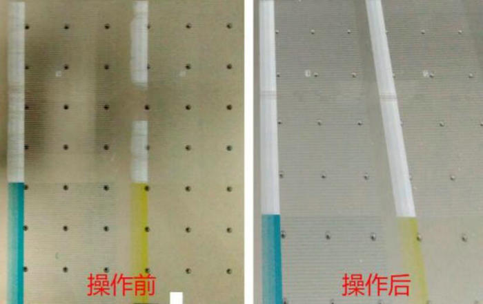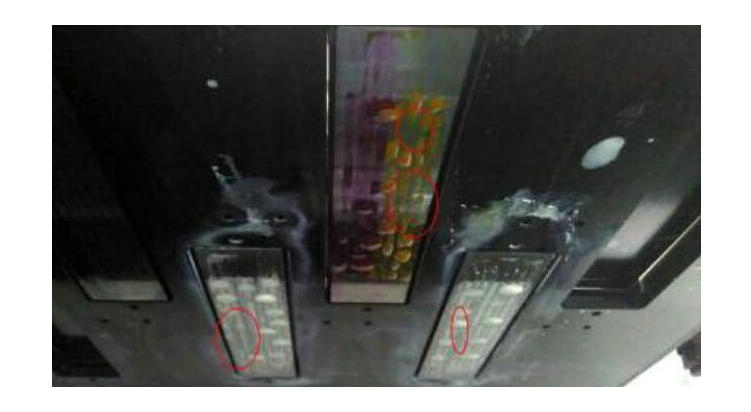 1. 壓墨發(fā)現(xiàn)局部噴嘴墨水很難出來。如下圖,紅色圈起來的地方,壓墨時墨水難出來,而其它地方良好。這是噴嘴表面干燥造成的??梢杂眠厜耗叢羾娮斓姆椒?,用壓出的墨水濕潤堵塞的孔。在操作過程中,需要注意必須使用細(xì)軟的無塵布,視噴頭表面干燥情況可適當(dāng)沾上清洗液擦拭,不要直接用干布擦拭,避免損壞UV打印機(jī)的噴頭。